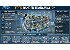 The Ford Ranger transmission came in several configurations depending on engine and trim: a 5-speed manual (M5OD-R1), a 4-speed automatic (4R44E or 4R55E), or the 5-speed automatic (5R55E) for V6 models. The 4R44E is common in 4-cylinder models and is known for band wear and solenoid failures over time. The 5R55E transmissions, used with the 4.0L V6, may experience torque converter shudder or erratic shifting. When replacing a Ford Ranger transmission, match the exact part number to your drivetrain configuration, as 2WD and 4WD units differ significantly. Rebuilt transmissions cost between $800 and $2,000 plus labor. Always replace the filter, gasket, and fluid during installation. Verify the output shaft length and tail housing before purchase to ensure a proper fit.