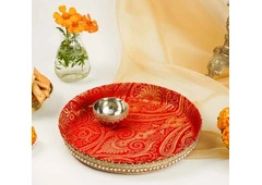 Crafted in bold and traditional red brocade, with gold details, this tikka thaal adds a royal touch to your shagun/tikka ceremony. It includes a thaal and matching small bowl with roli and chawal.
